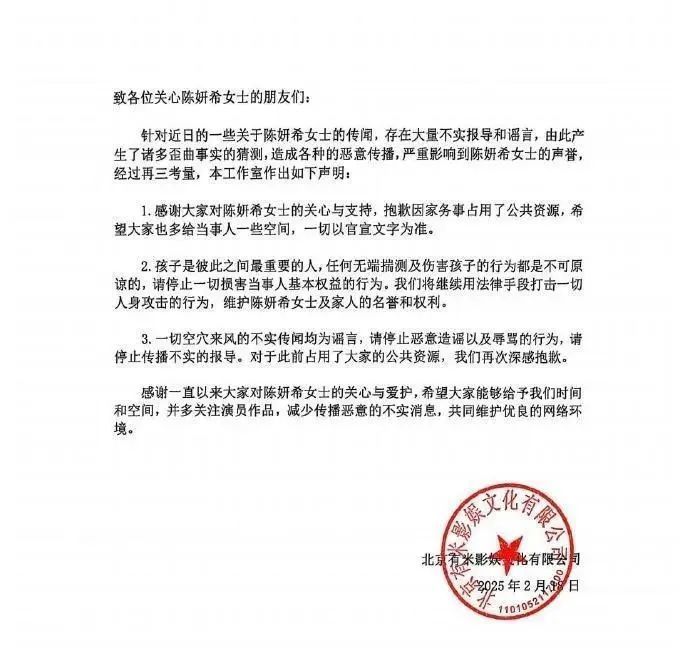 请罢手一切损伤当事东说念主基本权益的行为。咱们将不绝用法律时间打击一切东说念主身袭击的行为,眷注陈妍希女士及家东说念主的名誉和职权。