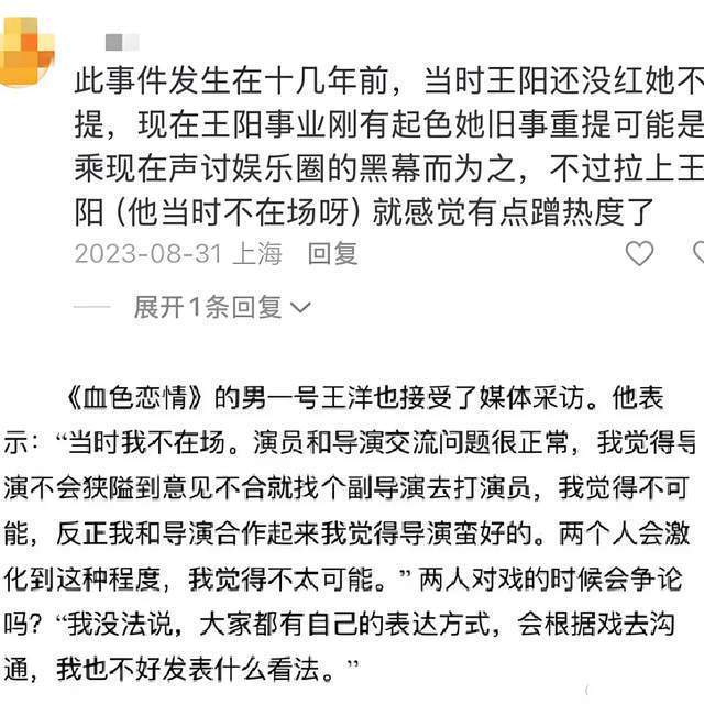 女演员孙菲菲在其酬酢平台发布长文,修起王阳粉丝对她“蹭热度”的质疑。博文履行包括两点:2023年的知道是应王阳条目所写。二是她被殴打时,王阳虽莫得目击现场,但过后有与演员们在宾馆贪图“导演打东说念主不坐蓐”之类,这就标明他从始至终都了了这桩暴力事件的始末。2010年,女演员孙菲菲在拍摄剧集《血色恋情》时,履历了由导演张汉杰一手筹划的暴力事件。
