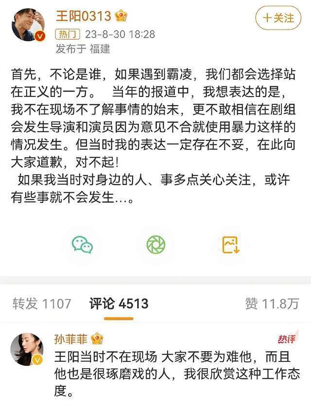 并且行为混过文娱圈的东说念主,孙菲菲懂得东说念主言可畏的道理道理,便依言照作念。自后她才发现,王阳在联系采访中暗意导演不会因为意见不对打东说念主,并强调与导演合营兴隆。这关于切实碰到伤害的孙菲菲而言等于妥妥的反水。毕竟在孙菲菲被打前,王阳在剧组常向她牢骚受羞辱,在她被打后却公开站队导演。他全心打造的“行胜于言”东说念主设绝对垮塌,部分网友以为王阳期骗受害者身份洗白我方却背刺对方。