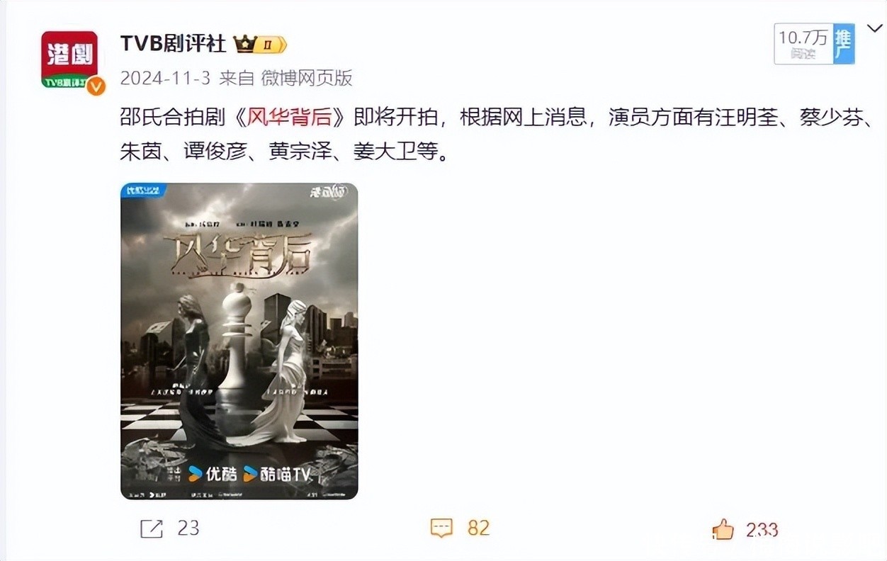 早前有报说念指TVB视后蔡少芬时隔多年将重回TVB拍摄重头剧《风华背后》,那时报说念该剧演员声势还有汪明荃、蔡少芬、朱茵、谭俊彦、黄宗泽、姜大卫等,音问传出后备受期待。