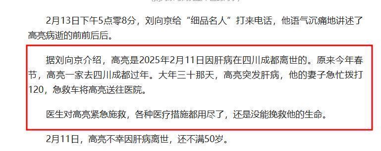 在刘向京发布讣告之后,自媒体博主“细品名东说念主”探究了他,得知了高亮归天的前前后后。