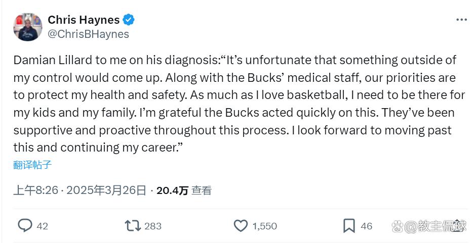 雄鹿队总司理霍斯特发布声明:“保险利拉德健康,是咱们的关键任务!咱们运道这次病症被实时发现,并连忙接纳颐养,这将助力利拉德尽快康复。”利拉德说:“发生这个很厄运。我期待和家东谈主一谈尽快克服难关,接续我的工作生存。”