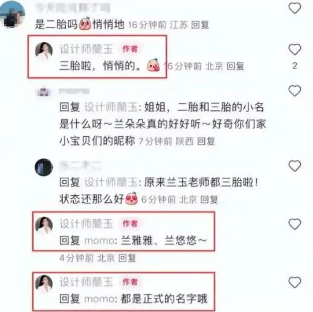 其实,早在前段时期,着名服装缠绵师兰玉官宣三胎时,就有网友在辩驳区祝福刘均。