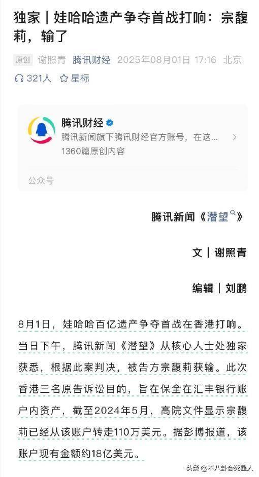 8月1日是三名私生子状告宗馥莉,挪用香港相信基金案开庭的日子,下昼某平台以“娃哈哈遗产争夺战打响:宗馥莉,输了”为题,回归了这场斗殴的论断。