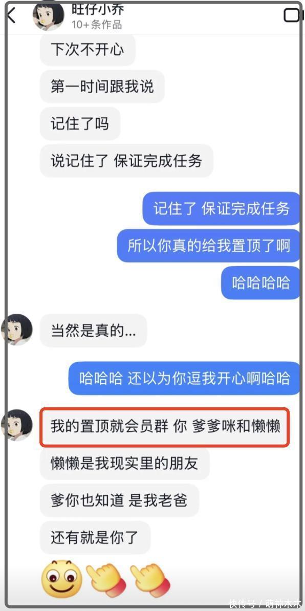 年老在持续充值后,也遂愿以偿成为了旺仔小乔的置顶会员群。旺仔小乔还给年老来了波糖衣炮弹,说我方的置顶会员群就三个,一个是我方的亲爹,一个是我方本质中的一又友,还有一个等于这位榜一年老,一言半字就给年老哄得相配繁盛。