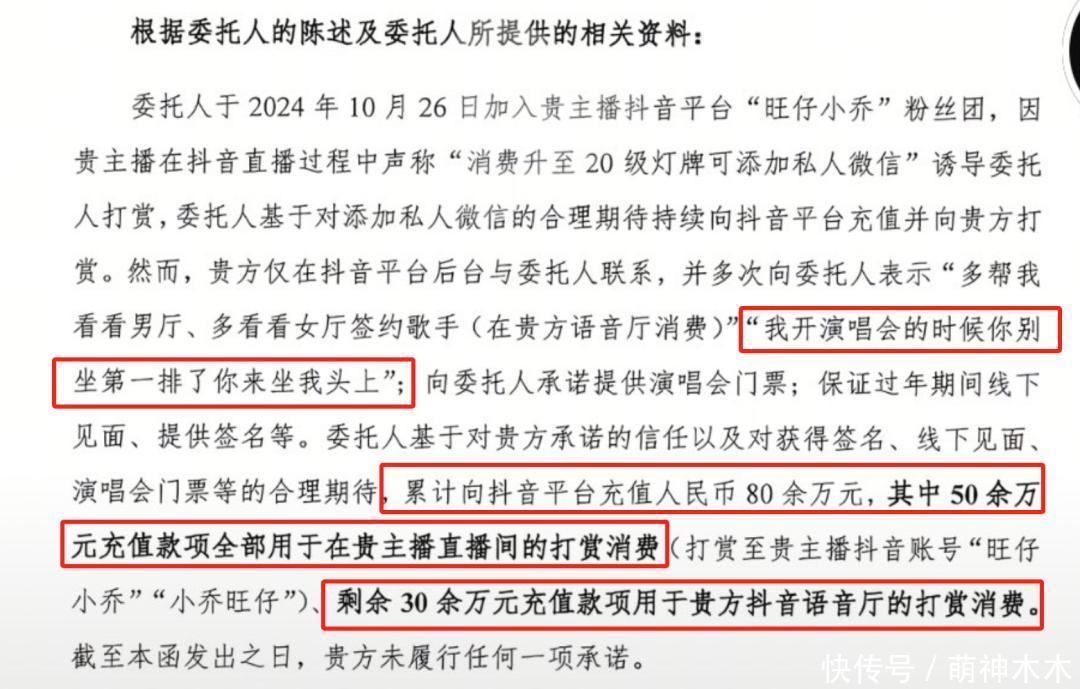 阐明榜一年老的讼师函得知,他本东说念主从客岁11月份初始在旺仔小乔本东说念主及旺仔小乔本东说念主所开的语音厅,奢靡总金额跳跃东说念主民币80万元,旺仔小乔通过频频聊天凭空情谊,承诺提供年度左近、签名、演唱会门票等其他本色,但临了无一作念到。