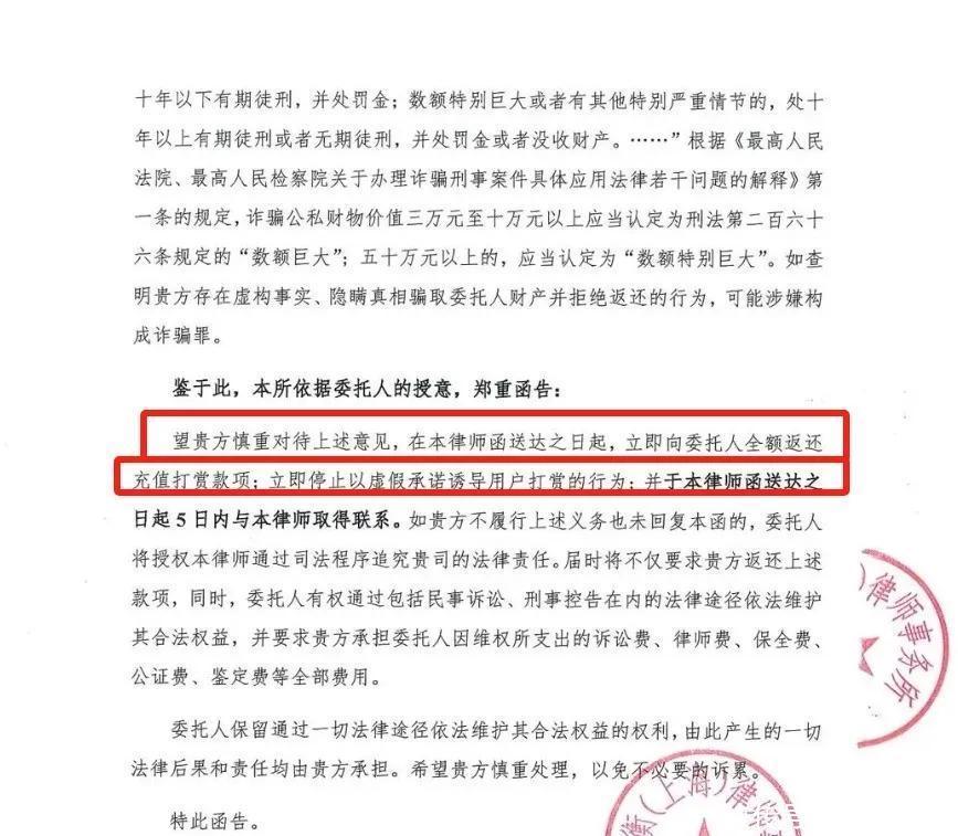 在旺仔小乔塌房后,鉴于旺仔小乔之前的当作,榜一年老终于幡然悔恨,合计其存在诓骗性率领奢靡当作,向旺仔小乔发讼师函,条目返还一齐充值打款项,而况立即罢手无理承诺率领用户打赏的当作。