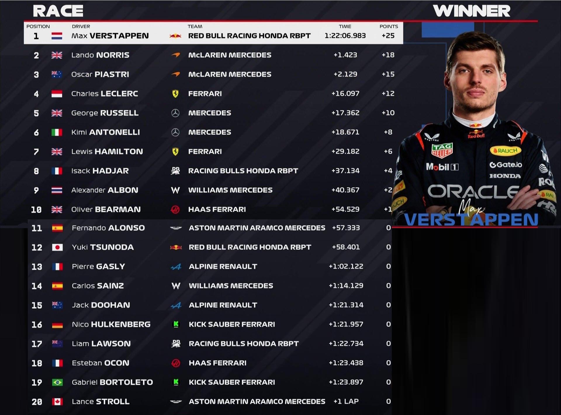 2025F1日本大奖赛正赛,红牛车队的维斯塔潘杆位发车夺冠,贯穿第四年在铃鹿取胜👑 迈凯伦车队的诺里斯亚军,皮亚斯特里季军。车手积分榜,诺里斯62分,维斯塔潘61分,皮亚斯特里 49分。