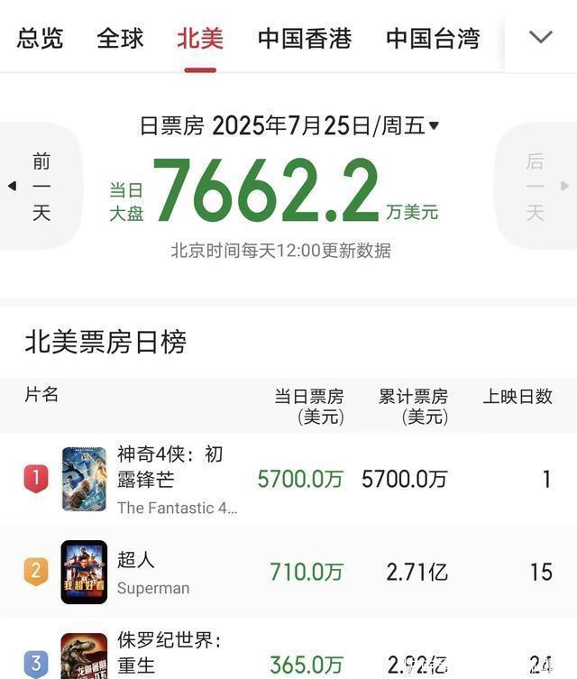 《神奇四侠》众人首日票房近5亿东说念主民币,国外评分和《超东说念主》极度,北好意思不雅众将助其罕见《哪吒2》。 《神奇四侠》是漫威影业于本年度推出的第三部超等豪杰大片,亦然“漫威电影天地”第六阶段的首部电影。而算作首部电影,它也如实为“漫威电影天地”的第六阶段开了一个好头。 该片于本年7月25日肃肃上映,第一天就末端了大爆。 在北好意思原土市集,《神奇四侠》的首日票房达到了5700万好意思元(超4亿东说念主民币)。这个成绩告捷罕见了DC的《超东说念主》,和北好意思年度首日票房冠军《我的天下大电影》比较,也就只好11万好意思元的差距。 由此可见,北好意思的不雅众是果然很可爱漫威的这部新片。