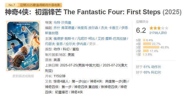 当今漫威的《神奇四侠》,众人首日票房接近5亿东说念主民币,可它在中国内地上映了三天,总票房却才刚刚冲突3000万东说念主民币。 另外,该片的国外评分很高,可在内地却只拿下了6.2分,刚破合格线。
