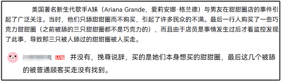 还有网友思起好意思国女歌手A妹(Ariana Grande)甜甜圈事件,比土屋太凤的行为更离谱,真的有东说念主舔了甜甜圈还不买!何况不啻一东说念主在那舔。