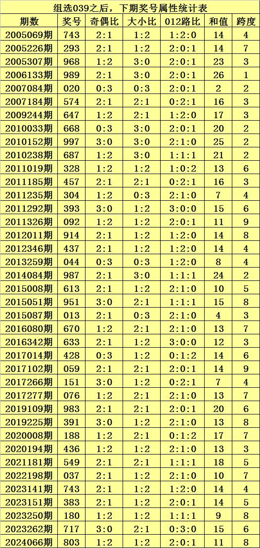 二、组选039分析:胪列三历史上已开出40次组选号码039了,其奖号和下期开出奖号统计如下: