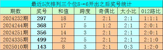 1、罗列三前两期个位区分开出号码8和6,历史上个位号码邻接两期区分出现8和6时,共有72次。在最近5次出刻下,其下期区分出现号码:297、368、356、499、143;