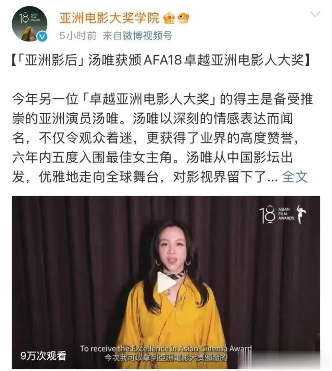 亚洲电影大奖官博还发布了一则汤唯修起获奖的视频,在视频中汤唯以熟练的粤语说,我方很雀跃不错拿到这个奖,3月16日与大众授奖仪式见。