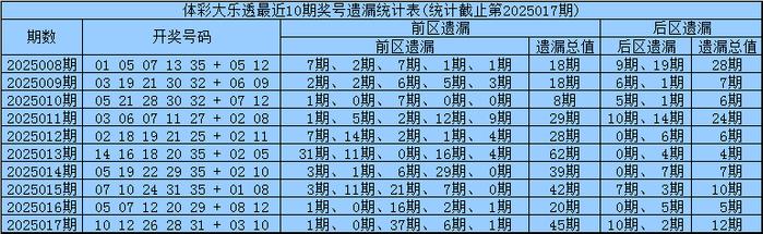 凡哥体彩大乐透第2025018期前区五区遗漏分析:(界说:遗漏0-3期号码为热码,遗漏4-9期号码为温码,遗漏10期及10期以上号码为冷码)