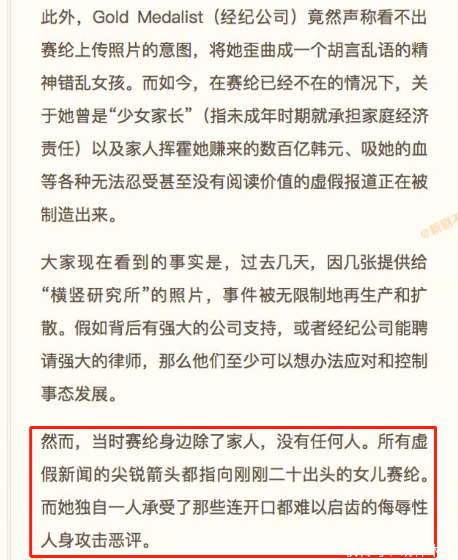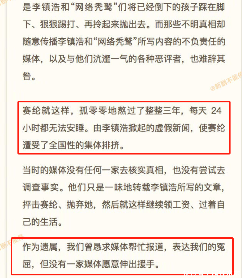 临了,金赛纶母亲示意,固然无法将李镇浩团队用法律进行解决,然而但愿促进缔造相关的法律和轨制,同期但愿规复金赛纶生前的荣誉和名声,雠校那些乖张报谈,包括像她在咖啡厅打工,却被责难造假炒作等,因为恰是这些演叨报谈,让孩子饮恨而终。