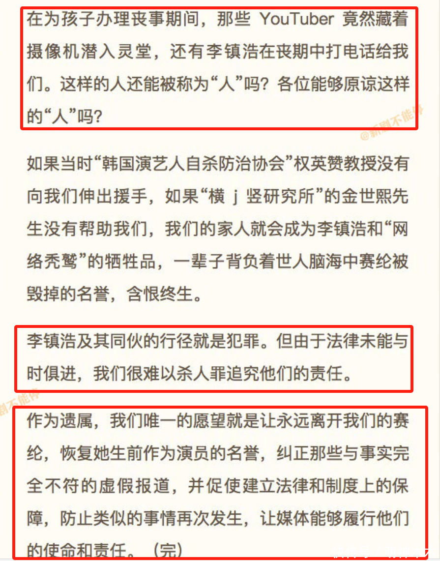 金赛纶母亲示意,犬子被李镇浩等东谈主分散流言袭击长达三年,导致金赛纶失眠无法安睡,直到金赛纶气馁死一火,还是莫得任何一家韩国媒体雀跃报谈真相,而李镇浩团队还在金赛纶丧礼时真切灵堂偷拍,同期络续打电话混乱家属,令东谈主祸害不胜。