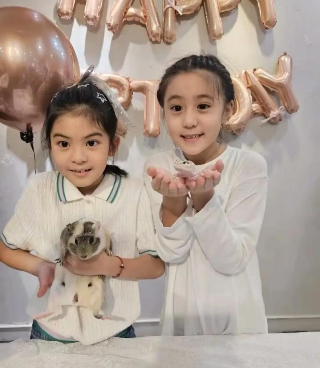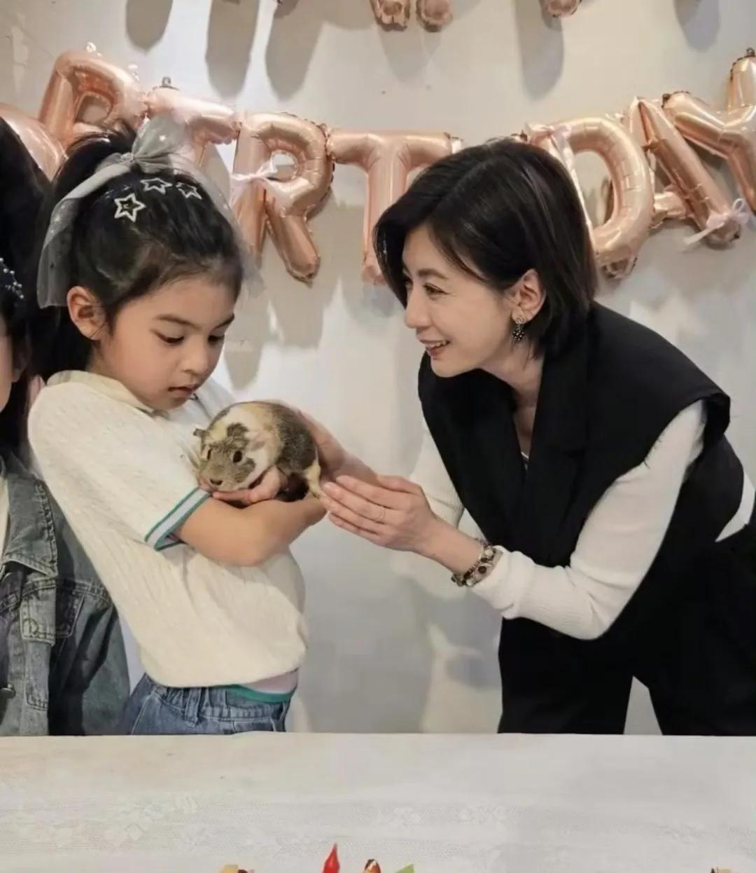 第三张相片是今日寿星波妞和姆妈的合影,波妞看入部下手里抱的天竺鼠,看得出来她真实很可爱天竺鼠,而贾静雯宠溺看着男儿,用手去摸天竺鼠。
