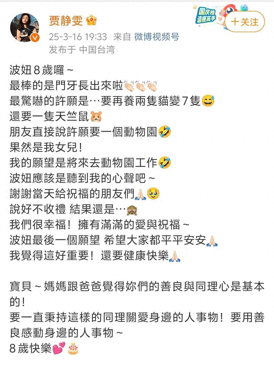 台湾女演员贾静雯在外交平台晒出一家为8岁男儿波妞庆祝诞辰的视频,还配长文写谈:男儿8岁了,门牙长出来了,还说谈男儿许的愿望是,要再养两只猫变7只,还要一只天竺鼠。