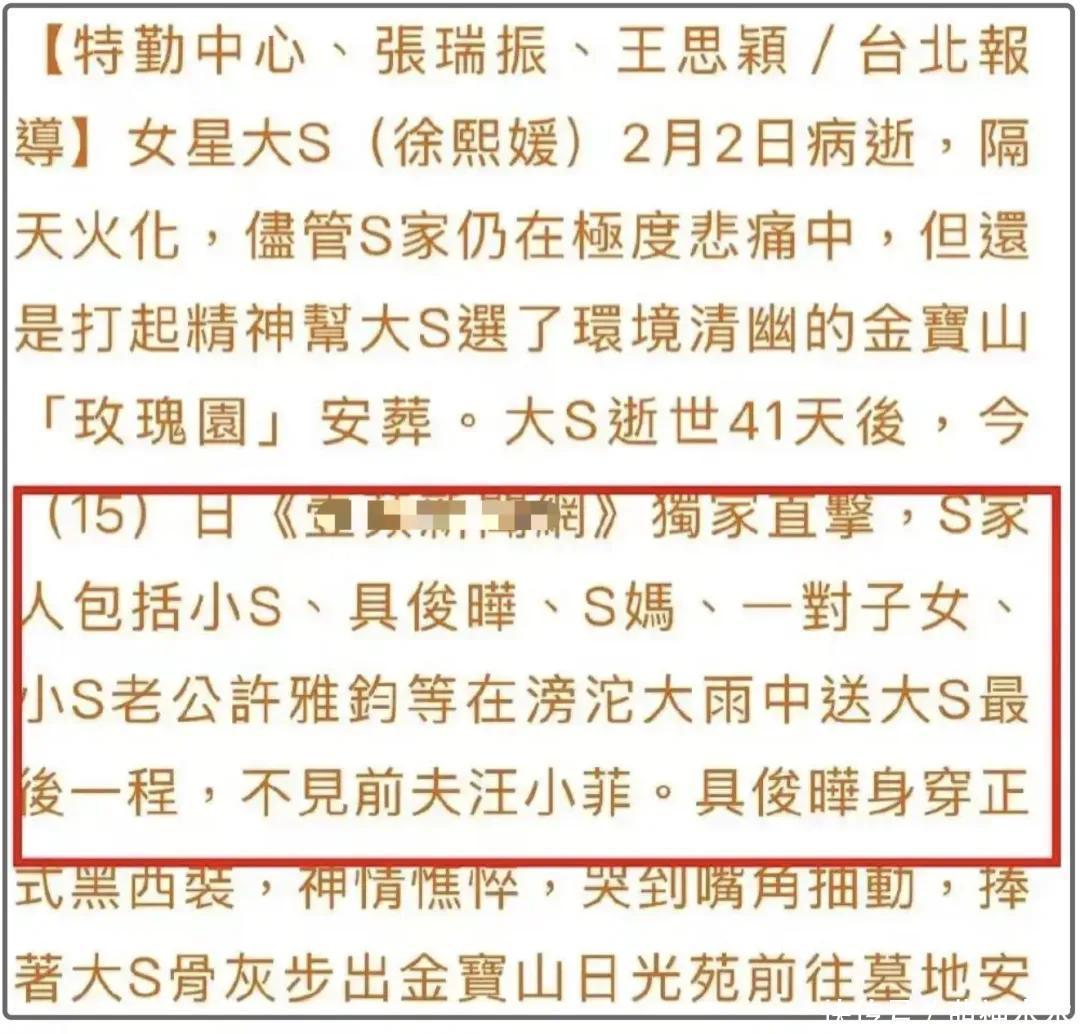 看到这里就秒懂了,居然是独家能得到S家复兴的台媒。隔三差五捧具俊晔踩汪小菲,写的新闻越来越离谱。况且更离谱的是,在大S埋葬今日,这家媒体还有益报说念了说大S的两个孩子也赶赴坟场,和徐家东说念主一齐,汪小菲莫得现身,其时还激发了不少网友有计划。