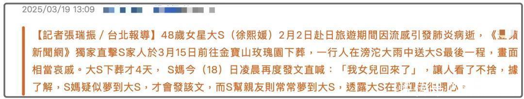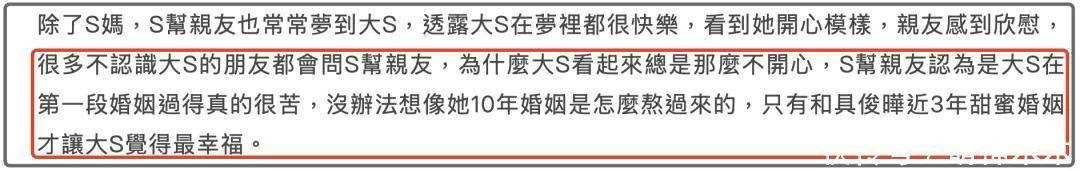 居然如斯,S妈发文后,台湾省独家媒体某果实时报说念,称是S妈梦到了大S这才发文,不仅是S妈,致使大S的其他亲一又也频繁梦到大S,还剖释梦里大S很兴奋,咱便是说这家媒体还是蛮横到能看到他东说念主梦乡了么?