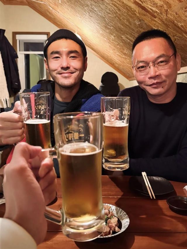位于二世谷主街的"松叶蟹の里"居酒屋内,阮经天身着深灰粗针毛衣搭配作念旧牛仔裤,未经修饰的胡茬在暖黄灯光下泛着青影。