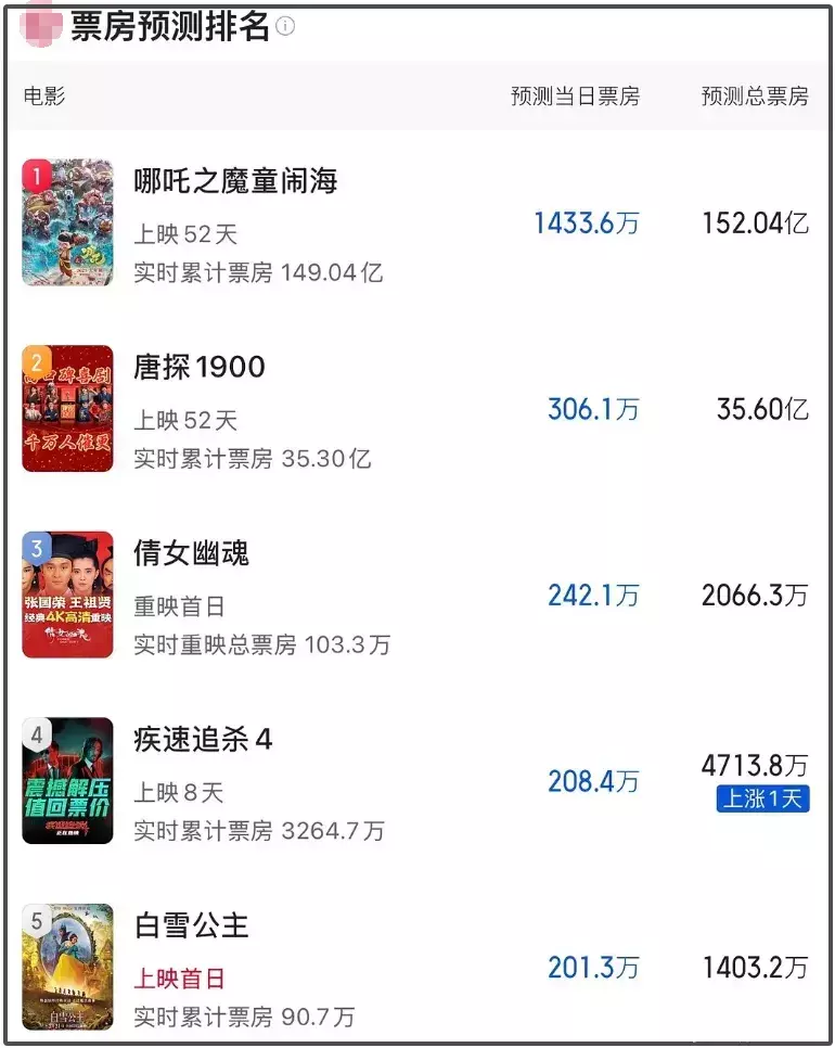 现在《白雪公主》日票房及时名次还是跌到了第四,累计票房110多万,并且基本莫得逆袭可能,专科购票平台瞻望《白雪公主》上映首日票房能有个200万就可以了,连《哪吒》零头都莫得,免强排进全天第五,发扬致使不如相通大扑街的《好意思队4》。