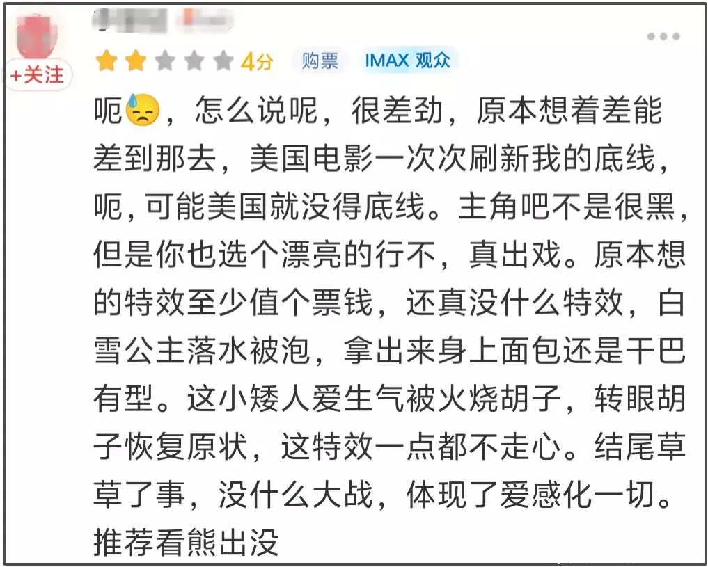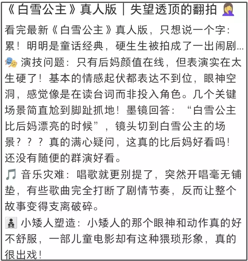 按照以往常规,临了本来该给《白雪公主》挽挽尊,说点每个东说念主口味不同,提倡望望正片自行感受之类的话,但是……有些电影也不瑕瑜看不可对吧?