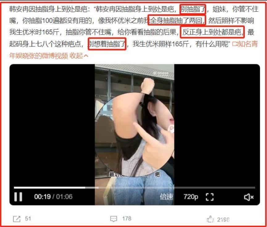 因为全身抽脂,韩安冉身上到处是疤。