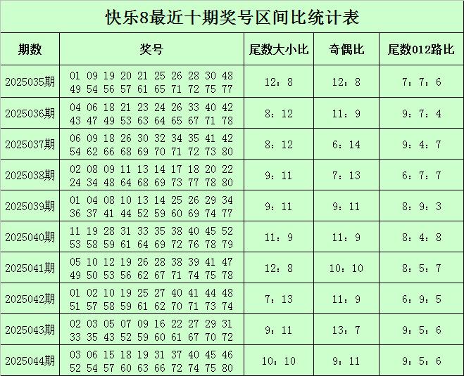 福彩沸腾8第2025044期开奖转头:03 06 15 18 19 31 37 40 45 46 52 54 57 60 63 66 72 74 75 80,其中奖号余数奇偶比为9:11,余数大小比为10:10,余数012路比为9:5:6。