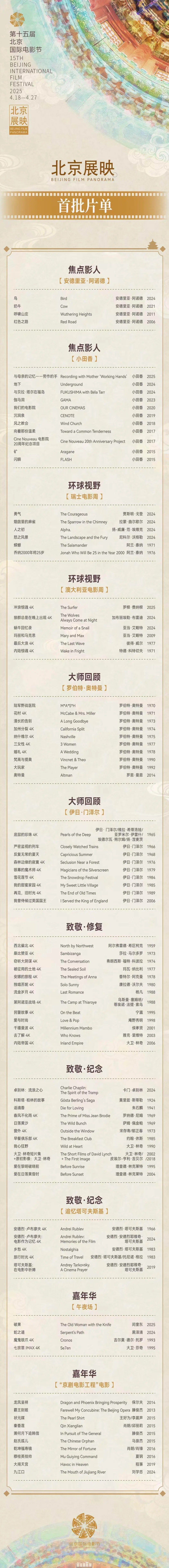 在筹谋选片上,值此中国电影降生120周年之际,筹谋推出“两甲子的喝彩·中国电影特展”;为操心宇宙电影降生130周年,疏淡筹谋推出“130年的自画像”主题,记录电影历史,畅想电影将来;初度在巨匠归来单位中推出以电影东谈主群像为归来对象的主题——“无限波浪:谈格玛95通顺三十年”;在电影巨匠罗伯特·奥特曼百年生日之际,推放洋内最大限制的奥特曼个东谈主作品归来展;精选多部影史经典佳作,忆苦思甜,从传统中吸收发展新能源。