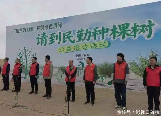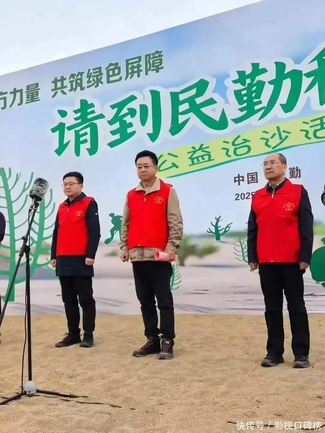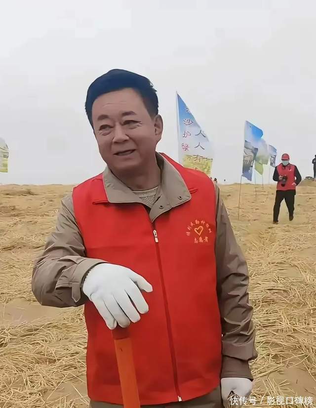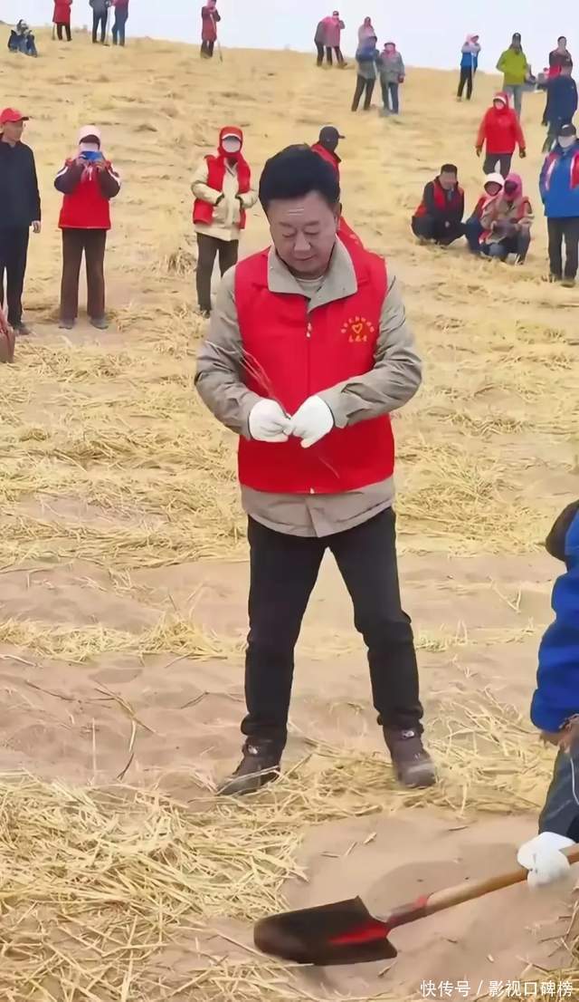 低调退休的朱军荒凉出面甘肃民勤县,以“防风治沙公益大使”的身份现身现场。