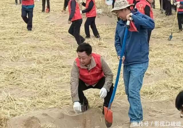 画面中的他,穿戴最闲居的卡其色外衣搭红色的公益马甲,用一口流利的家乡话和乡民打呼唤,同期他还积极反映民勤县发起的“请到民勤来种树”的行为。