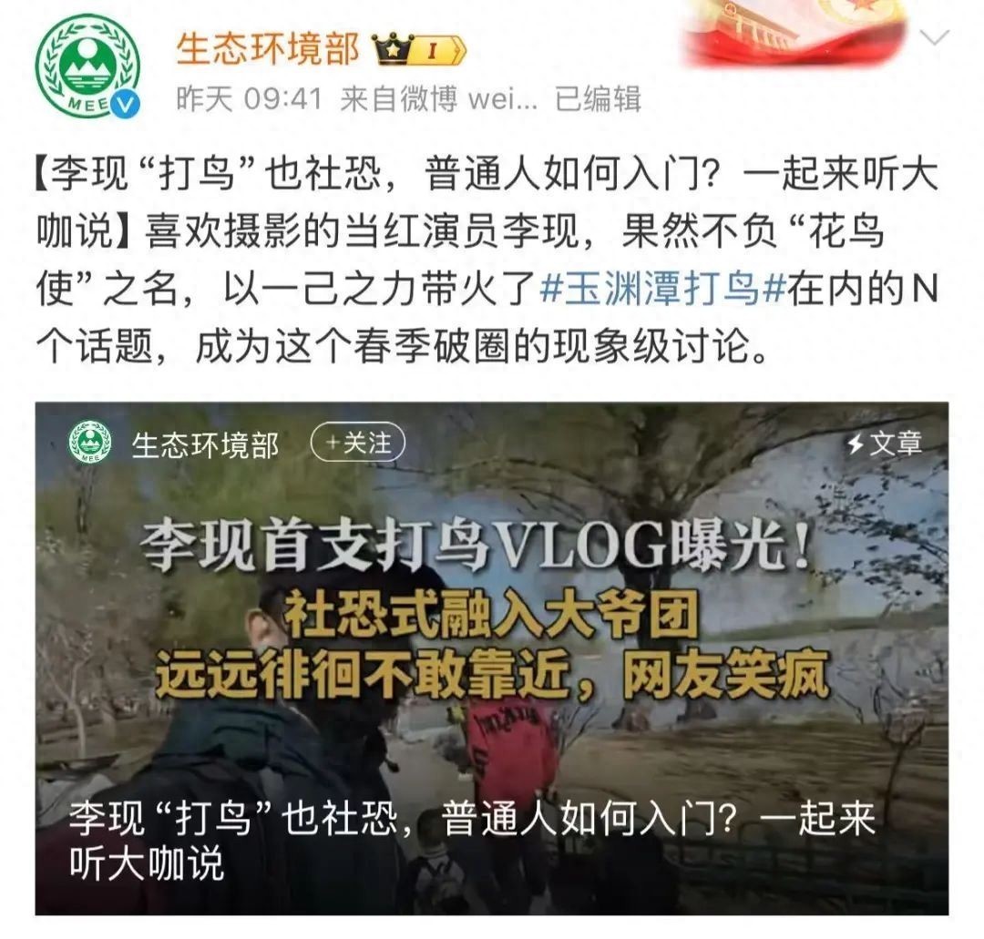 近日,演员李现因其对鸟类不雅察与拍摄的意思意思,收成了来自国度级部委的招供。4月4日,@生态环境部 发文称,心爱照相确当红演员李现 ,尽然不负“花鸟使”之名,以一己之力带火了#玉渊潭打鸟#在内的N个话题,成为这个春季破圈的风光级商榷。