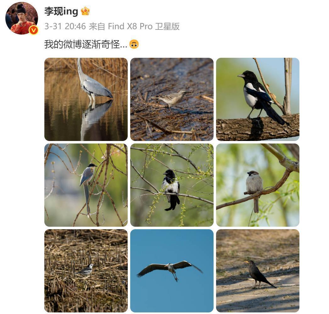 3月以来,李现屡次被网友偶遇在北京各大公园,背着专科照相成立,与资深照相爱好者们一同专注 “打鸟”(照相爱好者对拍摄鸟类的俗称)。李现也在个东谈主酬酢平台共享我方的 “打鸟功课”。