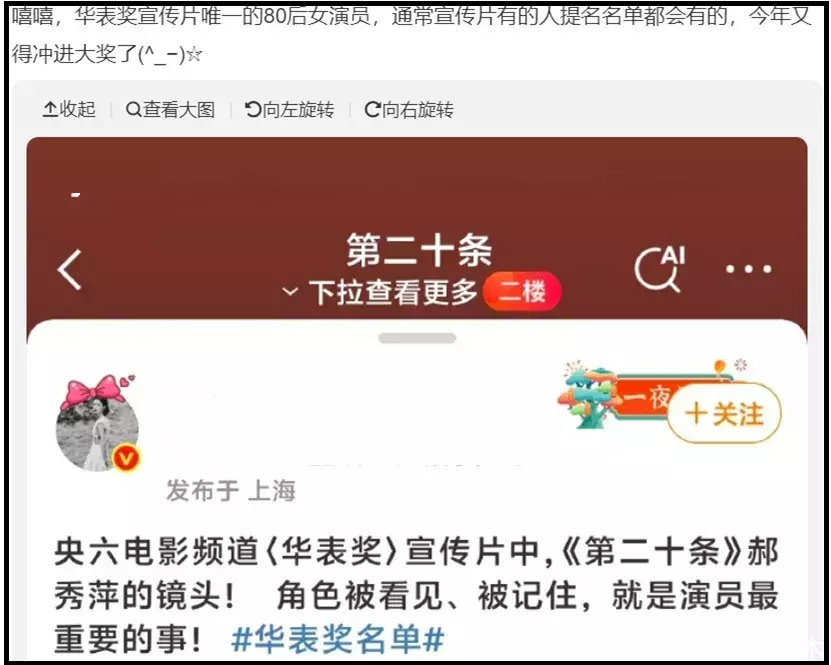 掐指一算,华表奖一届演员奖一共就两个,唯独四个东谈主可以赢得提名,《第二十条》雷喜讯和赵丽颖王人在华表奖宣传片中出镜了,唯独马丽莫得。