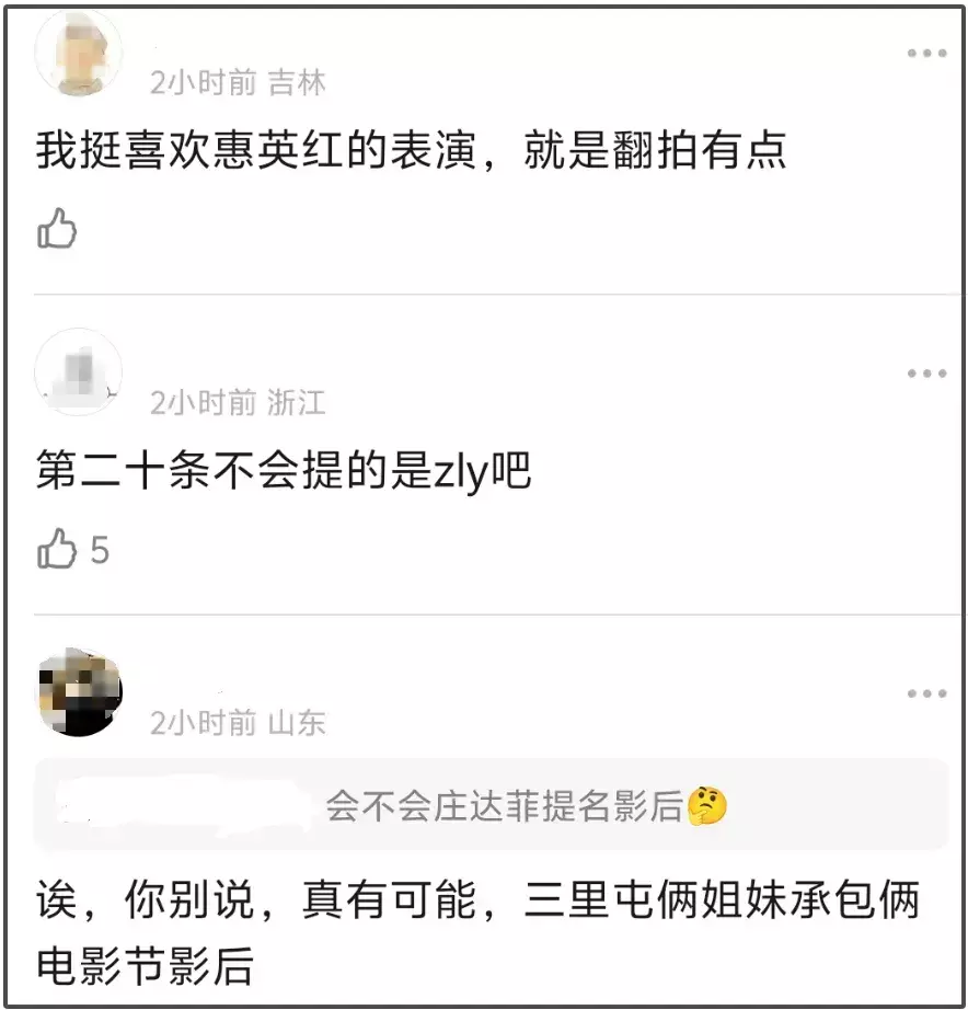 网友亦然越筹商越以为奥妙,频年好几个奖项王人是雷同的套路,先把竞争大、呼声高的从提名中摒除,拉几个竞争力不及的进来,再把奖给念念给的东谈主,赵丽颖是客串戏份少,惠英红主演的电影《我爱你》是翻拍,是以奖项是不是要给三里屯三姐妹之一了?