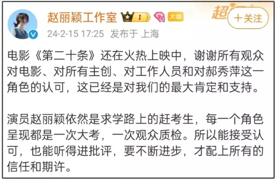 好在马丽为东谈主不蓄意,赵丽颖责任室实时回复,《第二十条》合座票房推崇也可以,风云才莫得进一步升级。