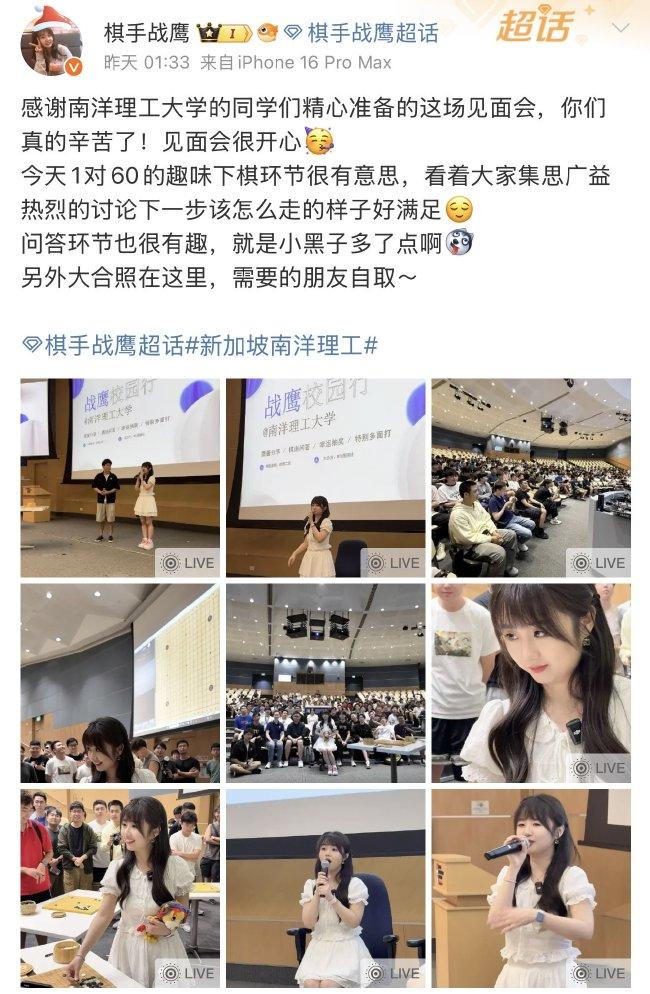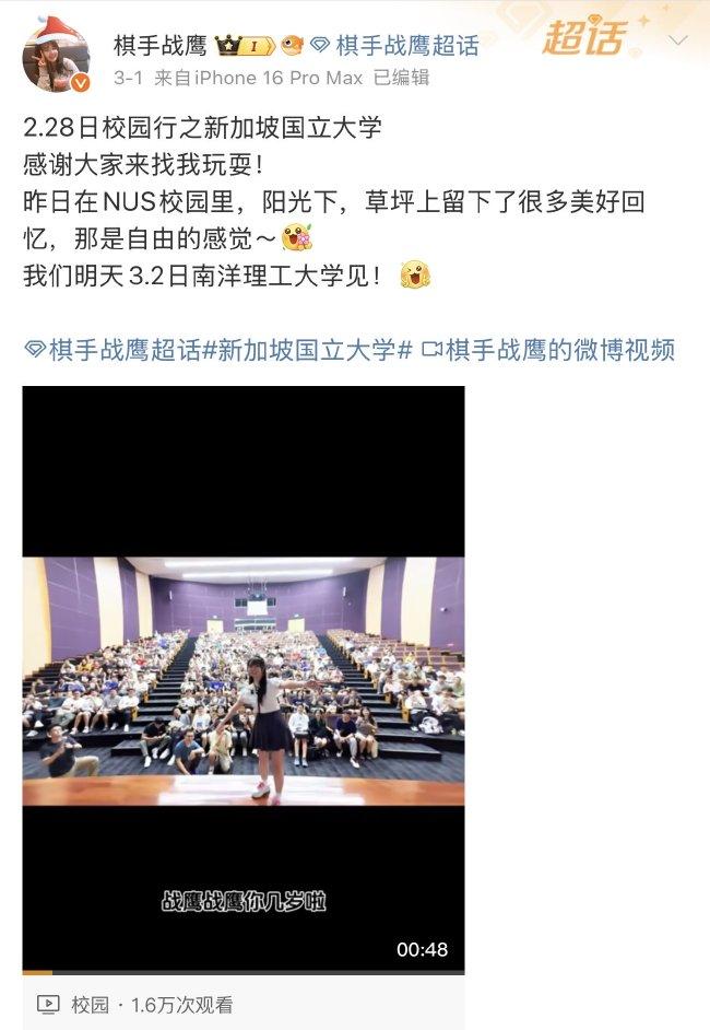 战鹰受新加坡国立大学和南洋理工大学邀约到访,视频中数百位战丝来到现场,战鹰在提升围棋的同期,还与高校学子们进行了互动疏通等当作。