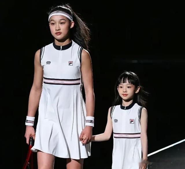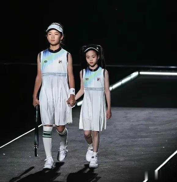 妹妹乐乐亦然被年事大几岁的姑娘姐带着上台,乐乐皮肤迥殊结净,手臂纤细,走在T台上有着满满的自信和冒失感。