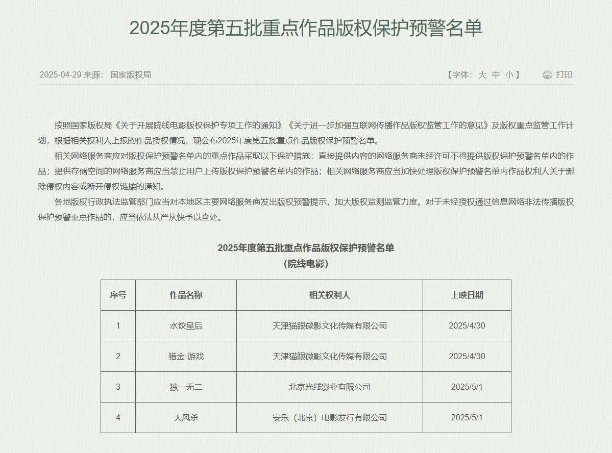 1905电影网讯 据国度版权局4月29日音问,2025年度第五批重心作品版权保护预警名单公布:《水饺皇后》《猎金·游戏》《唯一无二》《大风杀》四部影片在列。