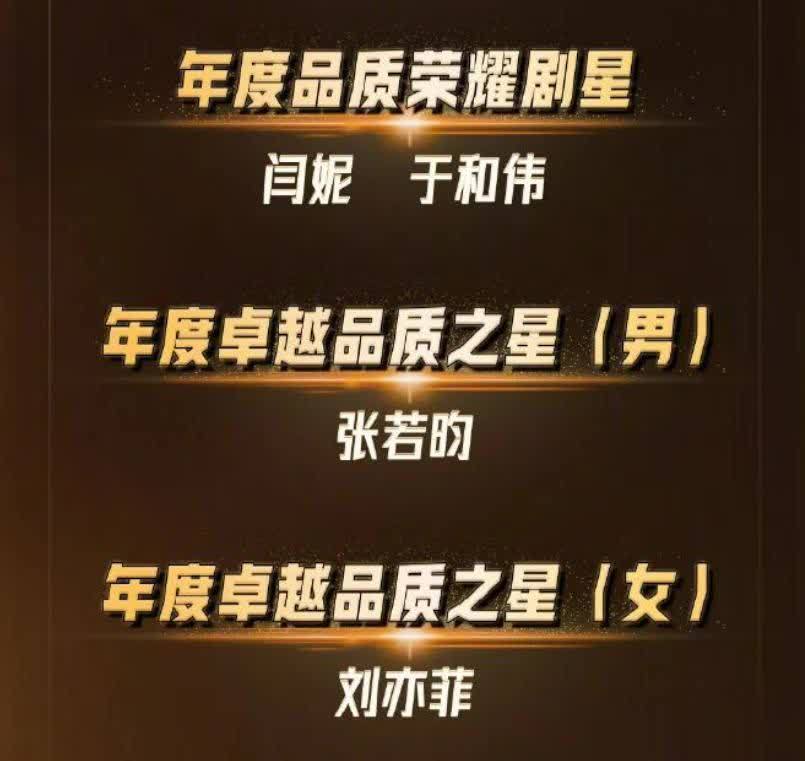 刘亦菲凭借电视剧《玫瑰的故事》获年度女主角奖。李现凭借电视剧《群星醒目时》《春色寄情东谈主》获年度男主角奖。