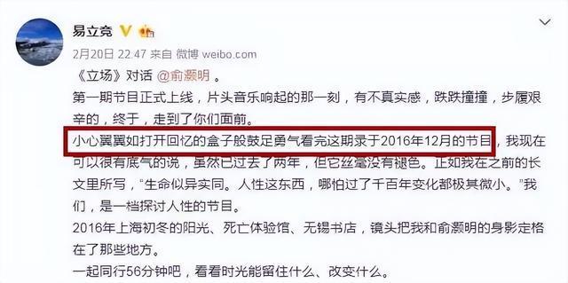2019年2月20号,《态度》开播,第一期节主义嘉宾等于俞灏明,主理东说念主易立竞发文才得知,这段视频尽然拍摄于2016年12月,距离播出已过程去了两年,不知说念若是俞灏明没火,他会不会出当今这个节目里,但在这段仅56分钟的访谈里,易立竞提到了俞灏明那段创巨痛深的情谊。