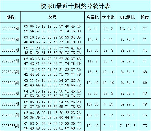 福彩倨傲8第2025053期开奖总结:01 02 04 06 08 09 18 22 30 33 36 43 49 53 55 58 61 67 69 76,其中奖号奇偶比开出10:10,大小比开出9:11,012路比开出7:10:3,和值为700,跨度为75。