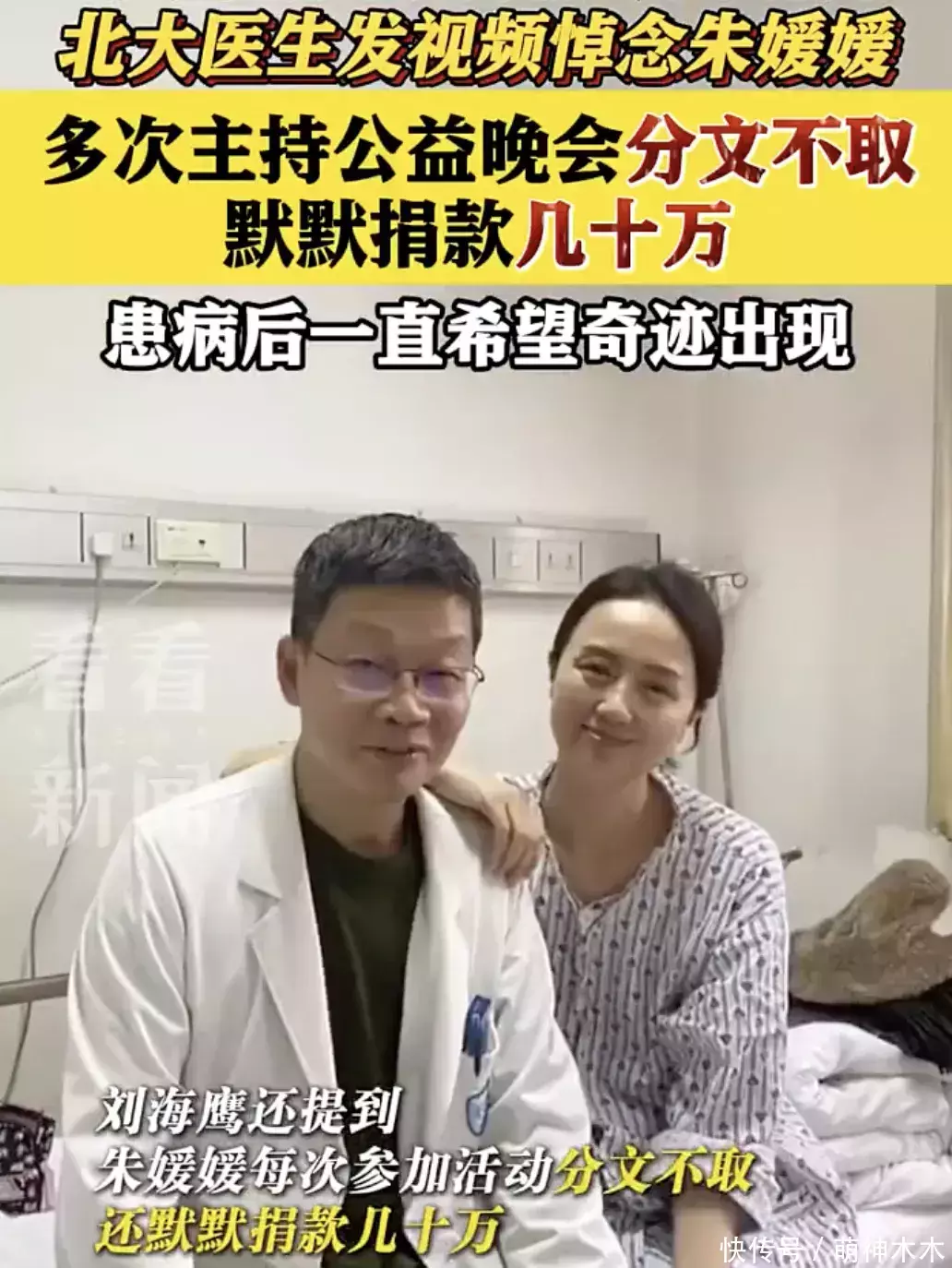在朱媛媛丈夫辛柏青发布讣告本日,北大知名大夫发视频吊祭朱媛媛,他与朱媛媛辛柏青证明多年,默示朱媛媛也曾屡次主抓公益晚会分文不取,擅自里肃静捐掉了几十万。他还默示,朱媛媛患病之后一直但愿古迹出现,还约好了康复后小聚一下,可谁也没念念到,朱媛媛照旧没能驯服病魔。