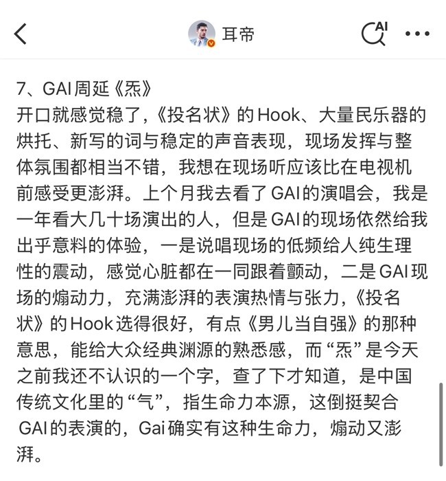 在《歌手2025》的舞台,GAI携歌曲《炁》一登场便气场全开,演唱全程行云活水,舞台感染力爆棚。微博话题#最稳的竟然是GAI#激勉无为珍贵与热烈筹划,不雅众纷纷齰舌“GAI的现场实力,稳得不像话,启齿便被顺从。”“前有米奇·盖顿的神气轰炸,后有格瑞丝·金斯勒的声压强袭,GAI却筑起了及第说唱的结界。”“在直播无修音的泼辣赛制下,GAI竟成了全场最稳的定海神针”。闻明乐评东说念主耳帝传诵GAI的舞台《炁》“启齿就嗅觉稳了,《投名状》的Hook、多数民乐器的衬托、新写的词与褂讪的声息阐扬,现场施展与举座氛围皆极度可以,我思在现场听应该比在电视机前感受更滂沱。”