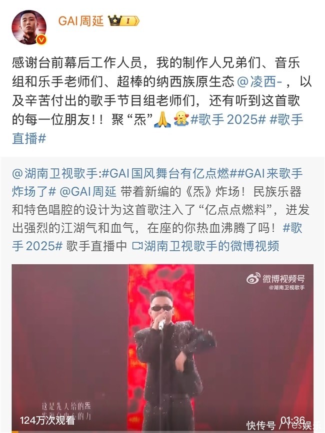 莆田安福家园 GAI周延《歌手2025》初舞台《炁》热度霸榜 行云活水气场全开