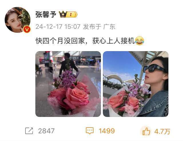 旧年12月17日张馨予在外拍摄作品多个月后回广州,何教官接机还奉上鲜花!并登上热搜榜呢!