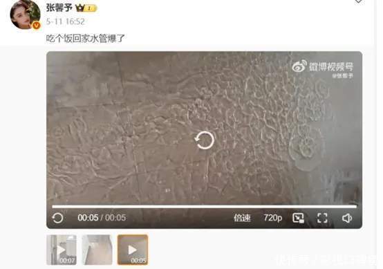 5月11日母亲节今日,张馨予在个东谈主外交平台上发了一则视频,配文:吃个饭回家水管爆了!