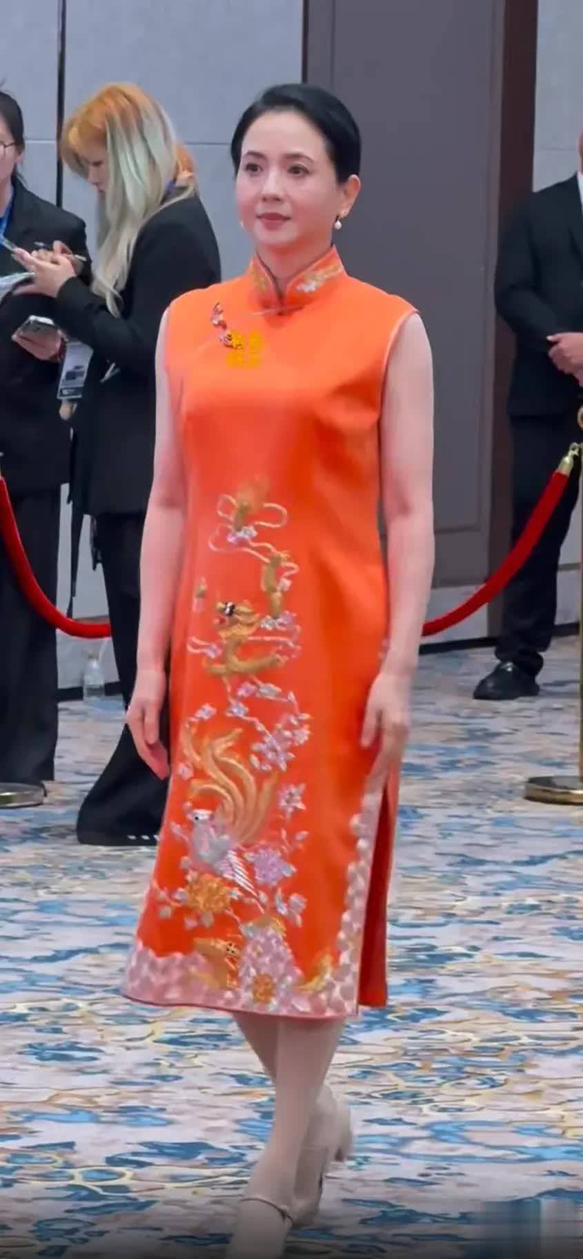 陶慧敏穿了一条并不好独霸的橙色刺绣旗袍,在她身上却能突显肤白貌好意思的上风,优雅中透着一股柔顺。